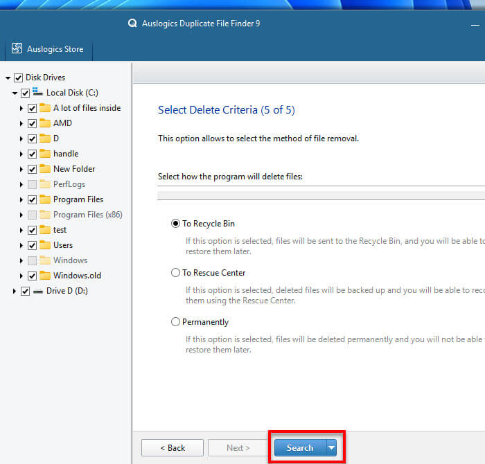 3. There are 5 criteria settings you can configure before executing the search. Configure as you see fit for each criteria setting. On the 5th criteria, you can select how the app will delete the duplicate files – to the Recycle Bin, Rescue Center (a place where the app will back up the deleted files in case you want to recover them later) or delete permanently. Once you have done with the search settings, click Search to begin the duplicate files search.