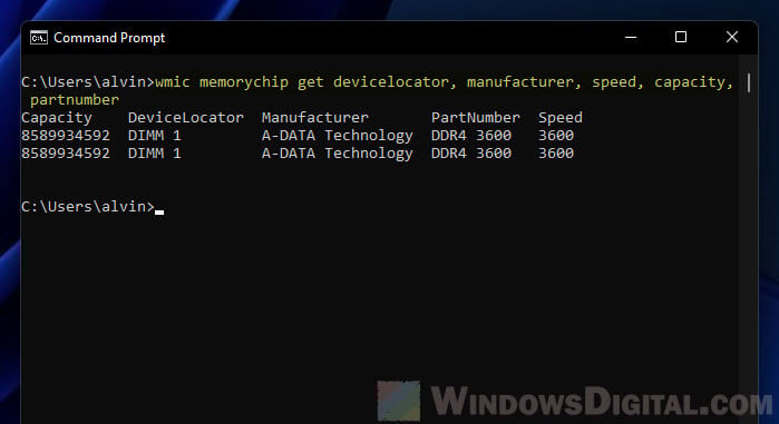 You can also use the following command line instead to check the full details about all your RAM sticks via Command Prompt in Windows 11.