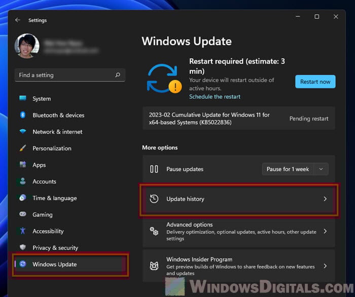 - Click on “Windows Update” then “Update history“.