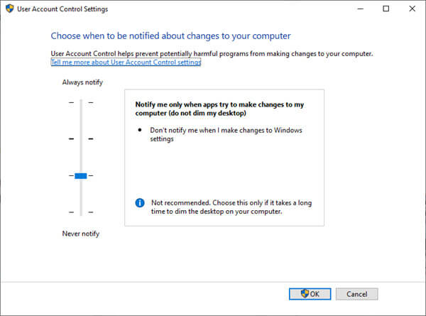Drag the slider down to reduce UAC level, or up to increase if you want to revert back to default settings. The lower the UAC, the lesser notifications and warnings you will receive.