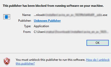 When you install or run an application or program that is not from any known publisher on Windows 11 or Windows 10, you may see an error or warning message that says “This publisher has been blocked from running software on your machine” and likely with no button like “Run anyway” or similar to proceed.