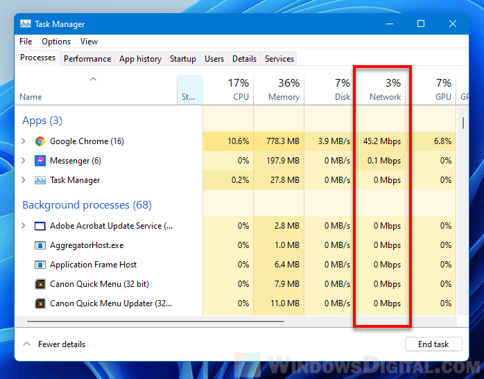 In Windows 11, Task Manager allows you to see details about your currently opened apps and system processes. You can view details such as CPU, memory, disk, GPU and network usage of all running processes. By checking on the network usage for each app, you can roughly see which app is using the internet on the PC.