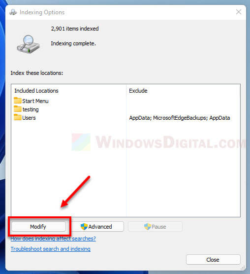 In the indexing options window, click on the Modify button.