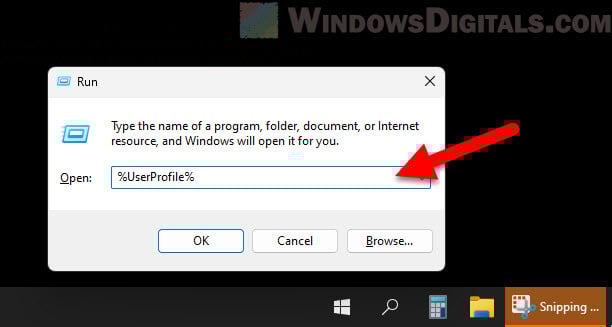 2. Type %UserProfile% and press Enter.Open user profile via Run command in Windows 11