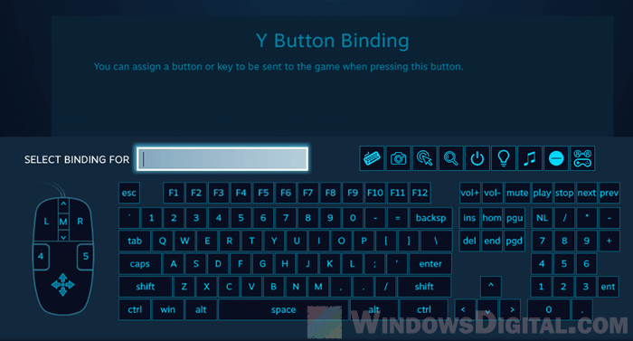 You can configure your controller’s buttons and analog sticks to any mouse or keyboard action you want. Simply select a button, then choose a style of input, and finally choose a key you want to bind the button to.