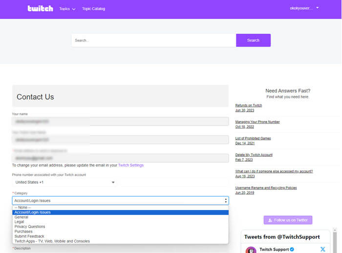 https://help.twitch.tv/. - Pick a category that fits your issue best.